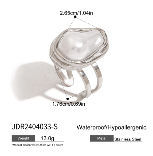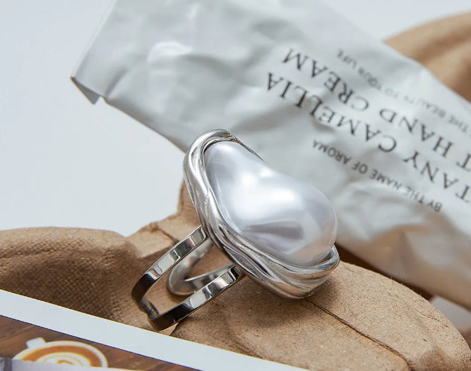 Una sortija moderna y sofisticada, diseñada en Stainless Steel (acero inoxidable) con una perla blanca estilo irregular que le aporta un toque artístico y elegante.