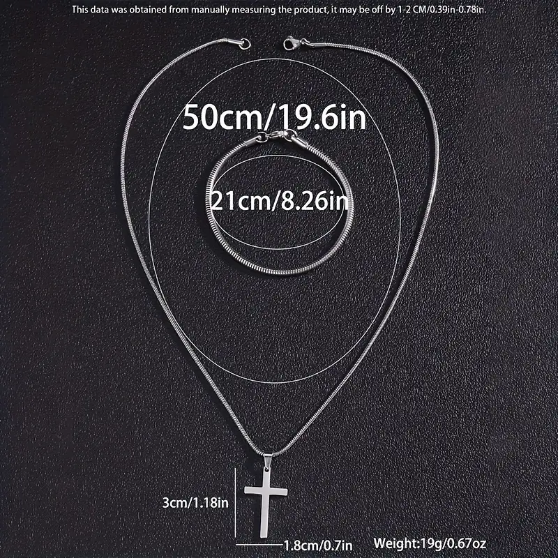 Incluye un collar con cadena y cruz elegante, acompañado de una pulsera de acero inoxidable que completa el look con un toque varonil y sofisticado.