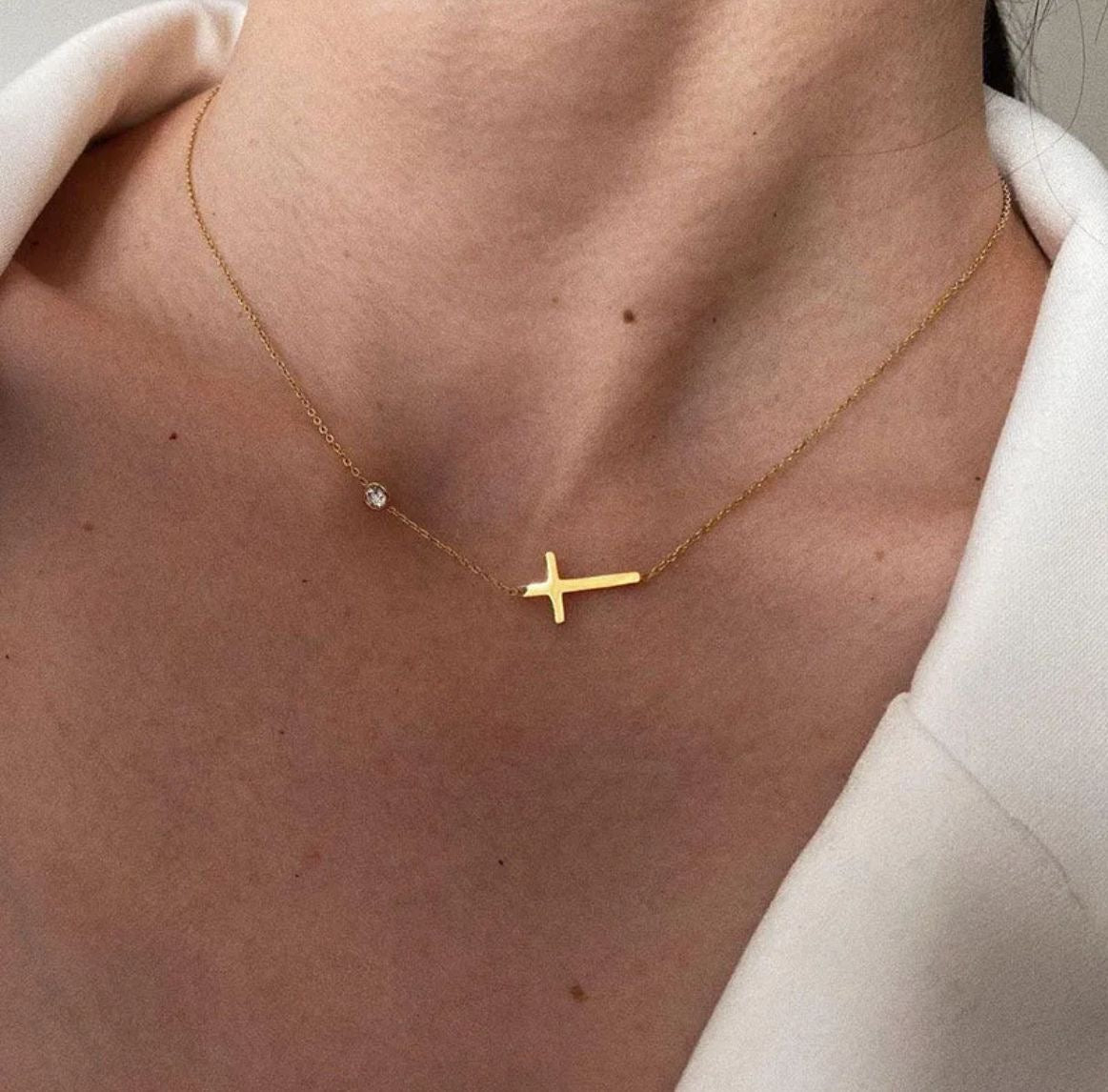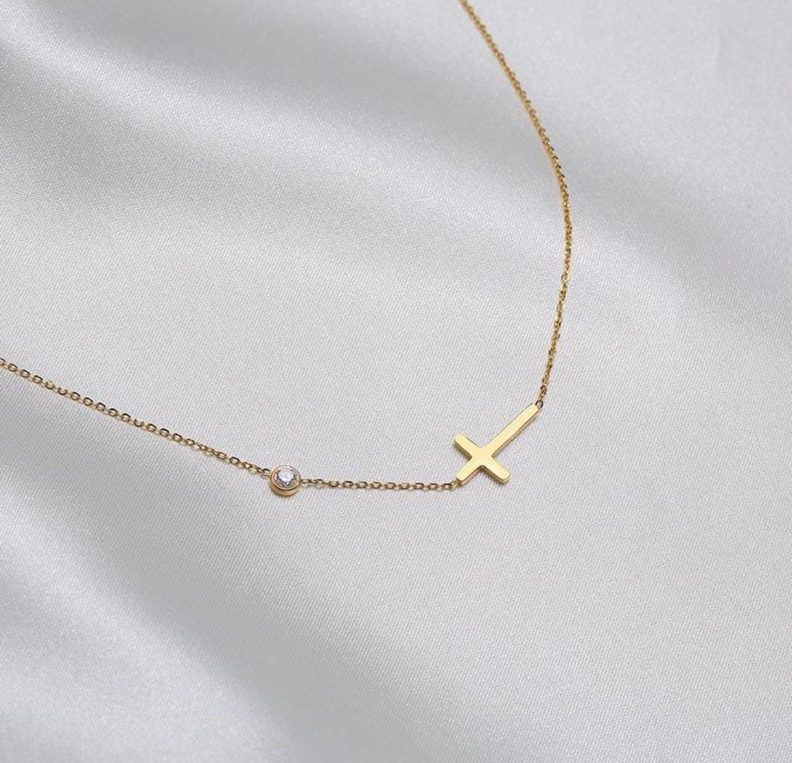 Collar en acero inoxidable (stainless steel) tono dorado con delicada cruz . Diseño elegante y simbólico, ideal para resaltar tu fe y estilo con un toque moderno.