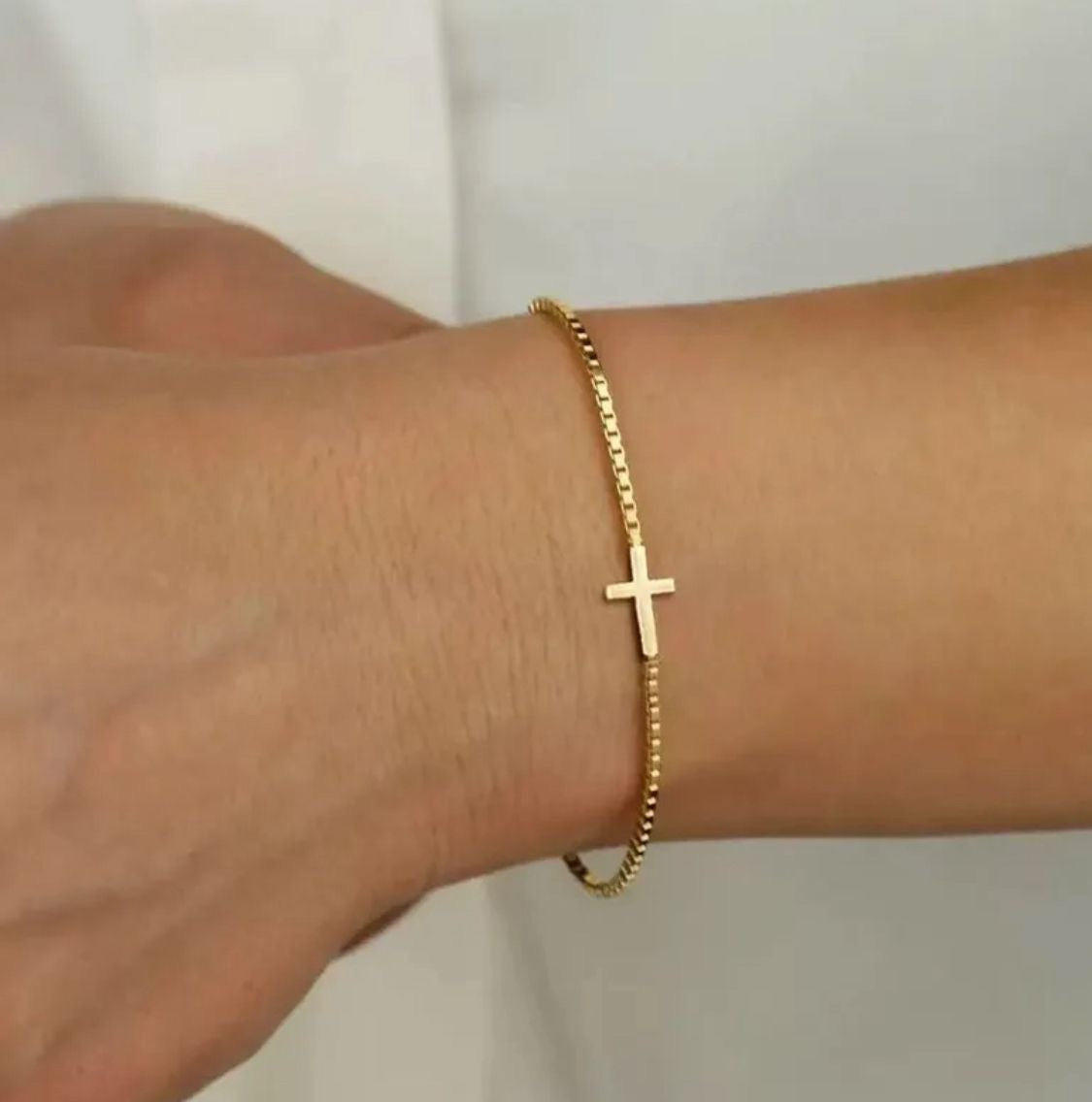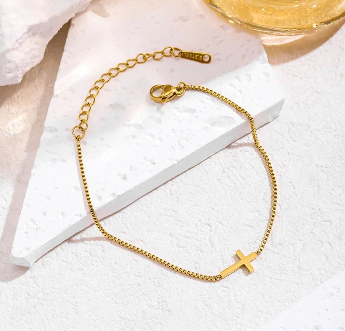 Pulsera ajustable en acero inoxidable (stainless steel) tono dorado con cruz central.