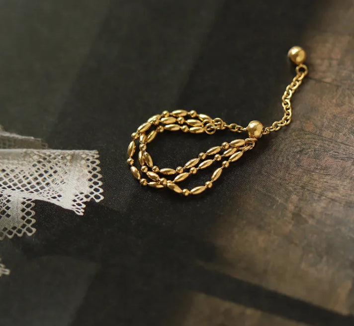Esta sortija triple con diseño de cadenas finas está elaborada en acero inoxidable dorado de alta calidad, ajustable para adaptarse cómodamente a cualquier dedo.